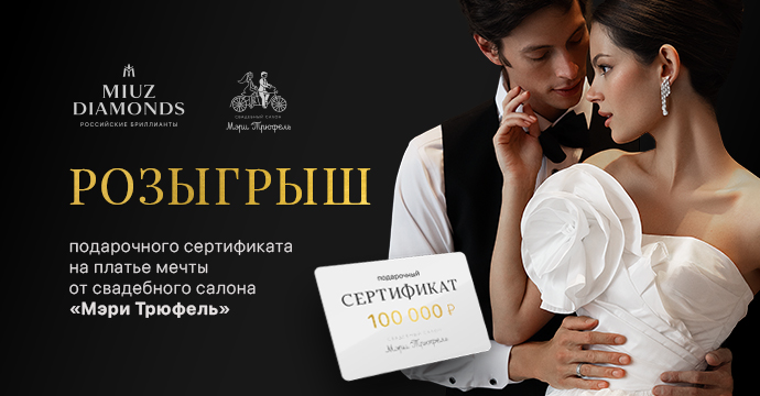 При покупке помолвочного или обручального кольца* на сумму от 100 000 рублей (после применения всех скидок) в период с 27 января по 13 февраля вы сможете принять участие в розыгрыше подарочного сертификата от Мэри Трюфель на сумму 100 000 рублей на покупку свадебного платья.
