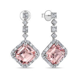 В этих эффектных серьгах мерцает самый женственный камень – нежно-розовый морганит – в ступенчатой огранке «Октагон». Изысканный дизайн, благородное сопровождение бриллиантов и цветных сапфиров делают это украшение ярким акцентом вечернего или коктейльного гардероба. Изделие красиво проработано мастерами также и с бокового угла зрения.