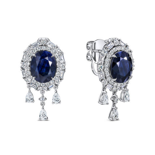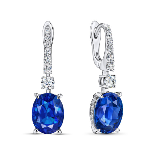 Два роскошных сапфира общим весом 6,95 карата эталонного ярко-василькового цвета вдохновили дизайнеров на создание этого благородного украшения для вечернего выхода. Прекрасные по характеристикам корунды в огранке «Овал», безусловно, доминируют в композиции серег, но изысканное бриллиантовое сопровождение камней круглой огранки общим весом 1,091 карата, подсвечивая их сотнями острых искр, усиливает сияние роскошной бездонной синевы.