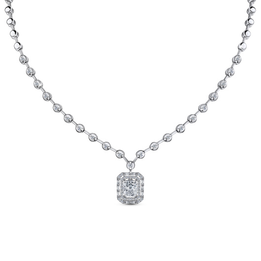 Изысканное украшение для особенных случаев выполнено из бриллиантов идеальной классической круглой огранки общим весом 2,22 карата, устремленных ослепительным потоком к центральной подвеске, созданной из бриллианта фантазийной огранки «Овал» весом 1,1 карата наивысшей категории цвета и обрамляющей его ослепительной оправы. Колье, самое аристократичное украшение, обязывает свою владелицу быть истинной леди. Значит, это украшение именно для вас!