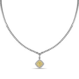 Бриллиант нежно-лимонного оттенка солирует в изысканном колье из коллекции Royal. Его филигранная огранка «Кушон» раскрывает драгоценный камень во всей красе. В строгий геометрический дизайн безупречно вписаны 105 круглых бриллиантов общим весом 2.756 карат. Это украшение — настоящее воплощение гармонии и целостности, которое станет верным спутником в жизненном путешествии.