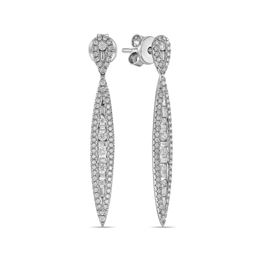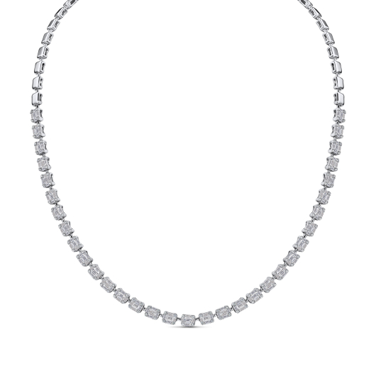 Торжественное аристократичное украшение для вечернего гардероба – яркая и виртуозная работа мастеров ювелирного дома MIUZ Diamonds. Колье соткано из множества деталей, каждая из которых представляет собой мозаику из собранных в единую гладь бриллиантов огранок «Багет» и «Круглая». Подобная сложная техника дает особенно яркий эффект преломления лучей света в драгоценных гранях и визуально объединяет бриллианты в один крупный кластер. 6,06 карата изысканной ослепительной красоты станут слагаемым вашего счастливого вечера.