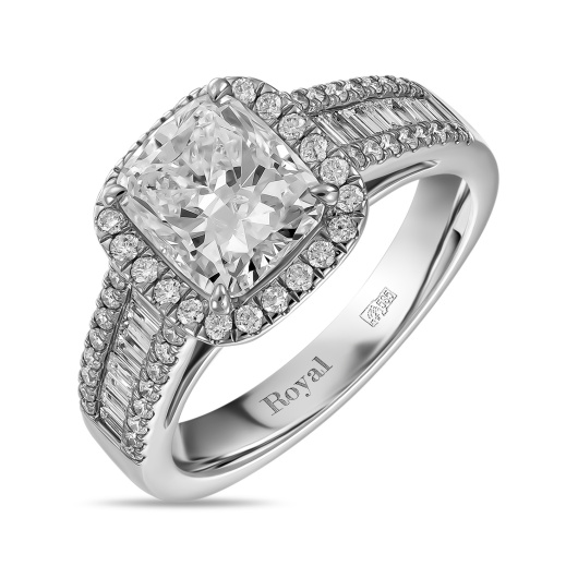 Стильное и лаконичное дизайнерское кольцо, в котором шинка «опоясана» стройным рядом бриллиантов в огранке «Багет», утопающих в белом золоте. Над ними возвышается центральный камень в огранке «Кушон» весом более 2 карат. Из-за больших открытых граней для такого типа огранки используют только камни, обладающие наилучшими характеристиками. Именно такие редкие бриллианты специалисты MIUZ Diamonds тщательно отбирают для украшений коллекции Royal.