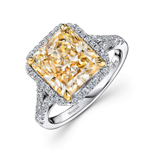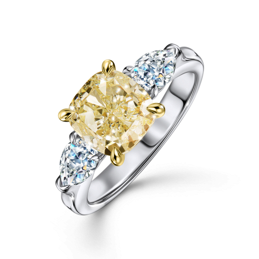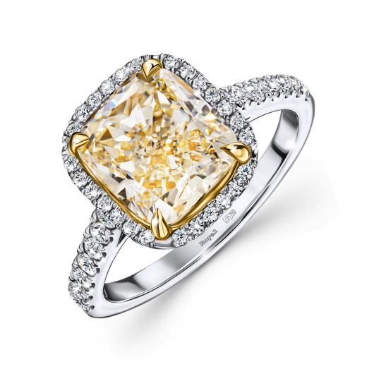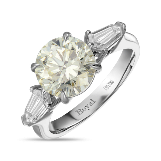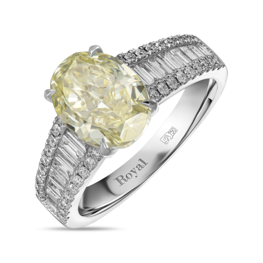 В главной роли лаконичной композиции этого кольца уникальный по всем характеристикам камень – сертифицированный желтый бриллиант ярко-лимонного оттенка исключительного размера – 4, 84 карата, который максимально бережно сохранен огранкой «Кушон». Камень величественно приподнят открытым кастом над шинкой и поддержан двумя бриллиантовыми «Багетами» общим весом 0, 53 карата. Безусловно, украшения такого уровня выводятся в ранг инвестиционных и становятся частью семейной истории.