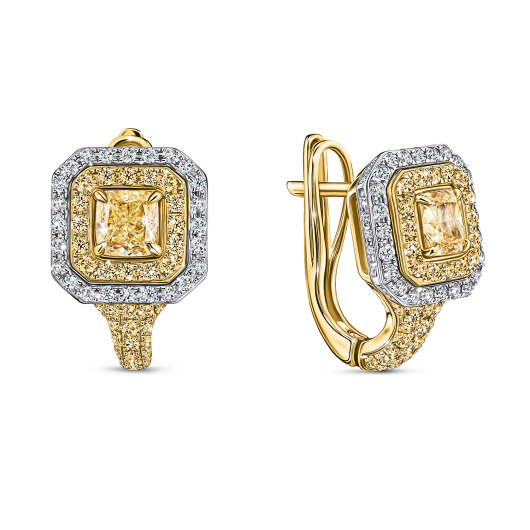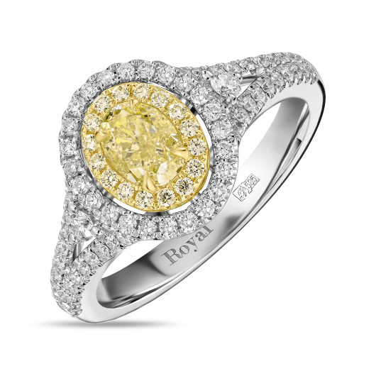 Уникальный бриллиант нежно-лимонного цвета в прекрасном обрамлении из желтого золота и прозрачных бриллиантовых инкрустаций рождает эффектное праздничное украшение. Центральный сертифицированный бриллиант весом 2,51 карата в огранке модифицированной овальной формы поддержан камнями огранок «Багет» и «Круглая» общим весом 0,73 карата, утопающими в изящно изогнутой широкой и комфортной шинке из золота 750-й пробы.