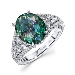 Главная звезда этого кольца — великолепный турмалин огранки «Кушон» весом 8,67 карат, окружённый багетными и круглыми бриллиантами. Чистое золото идеально подчёркивает насыщенность камней, выступая в роли холста для этого драгоценного произведения. Невероятная глубина цвета зелёного турмалина и геометрическая чёткость бриллиантов сплелись в украшении, которое создано, чтобы привлекать внимание.